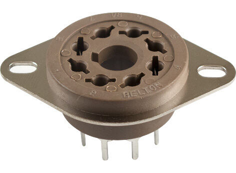 Highly insulated 8 pin tube socket with Micalex body and molded-in mounting plate commonly used for octal power tubes and also rectifier tubes. Tinned phosphorous bronze PC Board mounting terminals featuring fine contact integrity. Mounts above or below the chassis with 30mm chassis mounting hole. Slotted mounting holes with centers approx. 40mm. PCB mounting pins approx. 9.5mm long