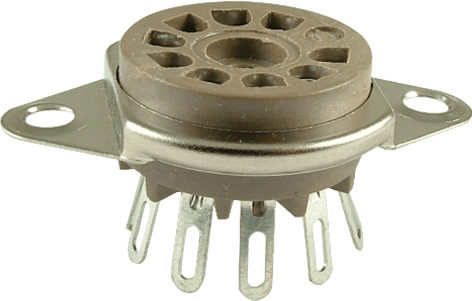 Highly insulated 9 pin tube socket with Micalex body and molded-in mounting plate commonly used for preamp tubes and also EL84 power tubes. Tinned phosphorous bronze terminals featuring fine contact integrity and solder lugs. Mounts above the chassis with 19.5mm chassis mounting hole. Mounting holes with centers approx. 28mm.