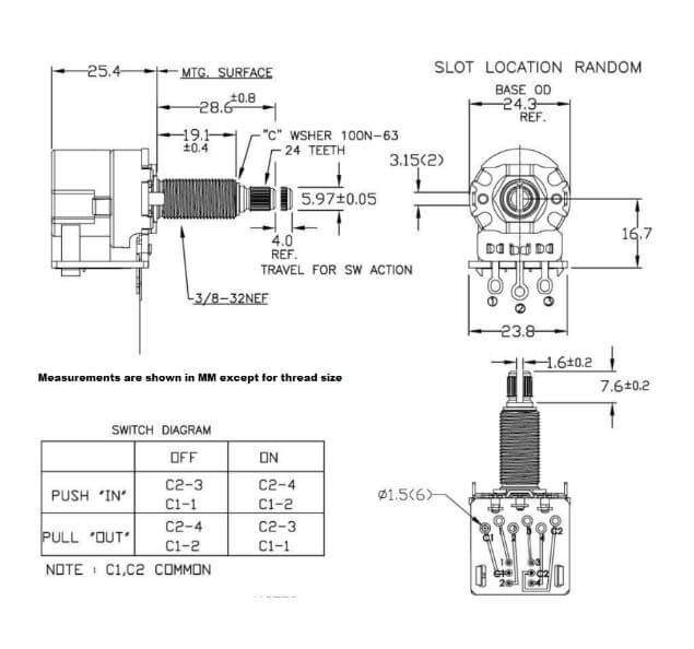 High Quality CTS control pots are used in all mainstream American Guitars. Add a push/pull switch to your guitar using the existing holes in your pick guard or body to add phase switching, coil tapping, series/parallel, etc. The shorter body height and side mounted contacts require far less space (1” or 25mm depth ) making them ideal for shallow body cavity guitars. Compatible with 24 - spline, fine knurled knobs. Hex nuts, flat washer, and lock washer are included with each pot.