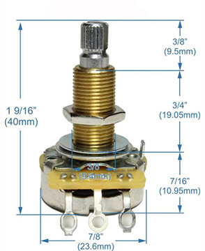 CTS control pots are used in all mainstream American Guitars. Featuring a 500k ohm Audio or Linear Taper, and long-life 24 spline brass split shaft. The 3/4" long shaft type are ideal for use as volume and tone controls in Humbucker carved top guitars, including Gibson LP. 24mm diameter body, includes locking washer and nut.