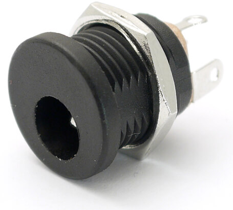 2.1mm Industry Standard DC Jack for stompboxes. Switched to automatically disconnect the battery when a plug is inserted into the jack. Requires a 12mm panel mounting hole. Available in black